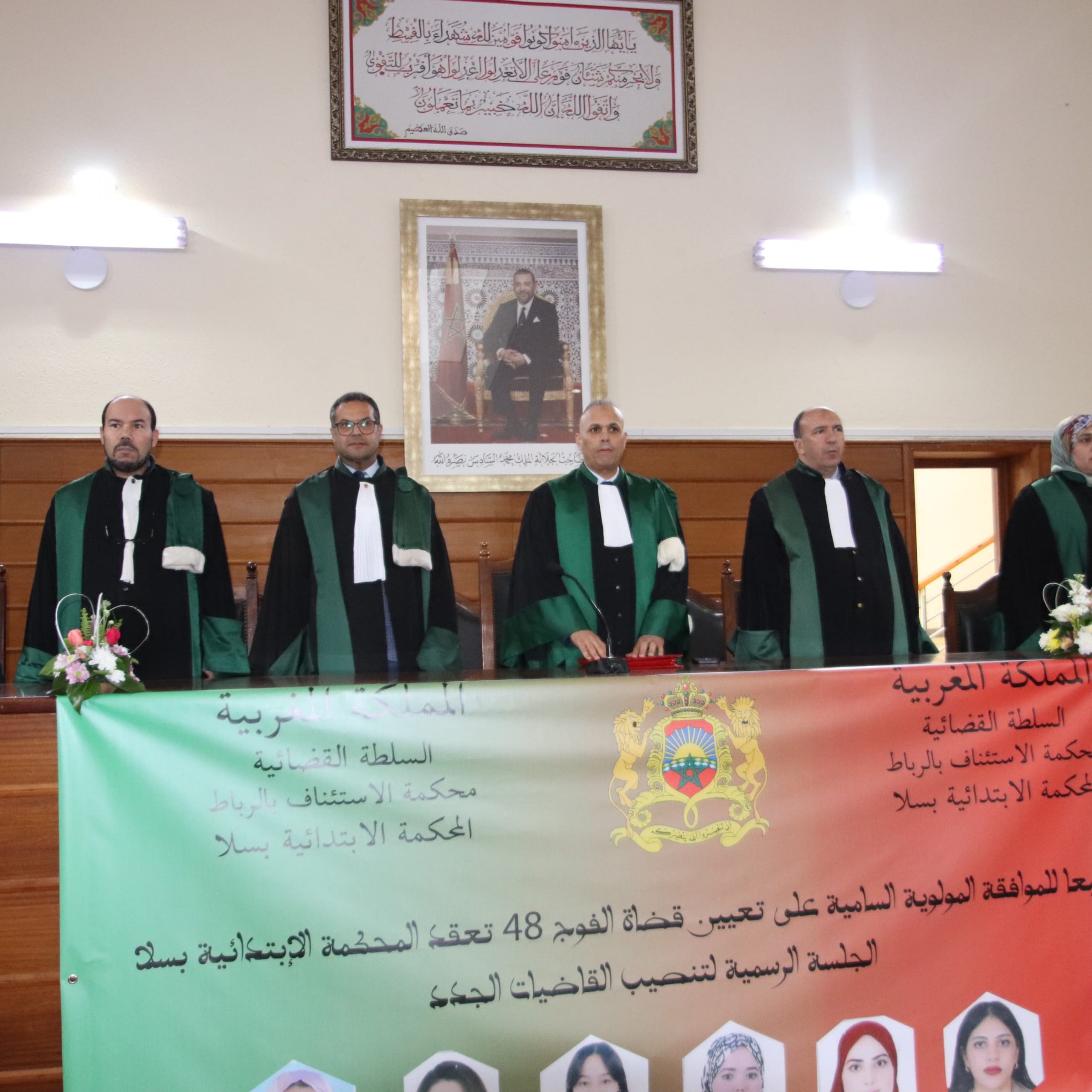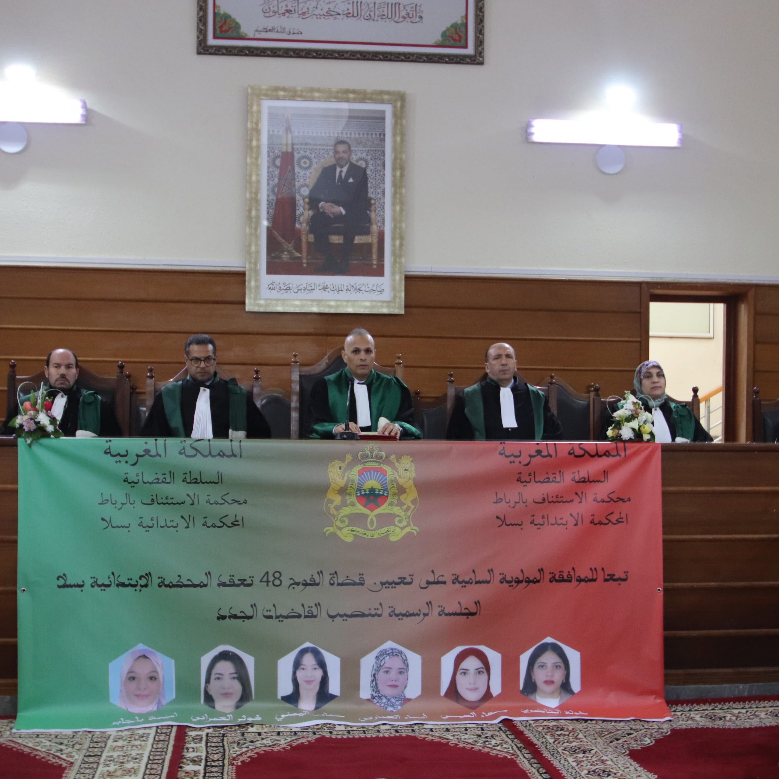 شهدت القاعة الكبرى بالمحكمة الابتدائية بسلا يوم الأربعاء 21 رمضان 1447 الموافق 11 مارس 2026 مراسم تنصيب قاضيات جدد التحقن للعمل بالمحكمة تنفيذا لقرارات المجلس الأعلى للسلطةالقضائية بتعيين قضاة الفوج 48 ،تبعا للموافقة الملكية السامية .